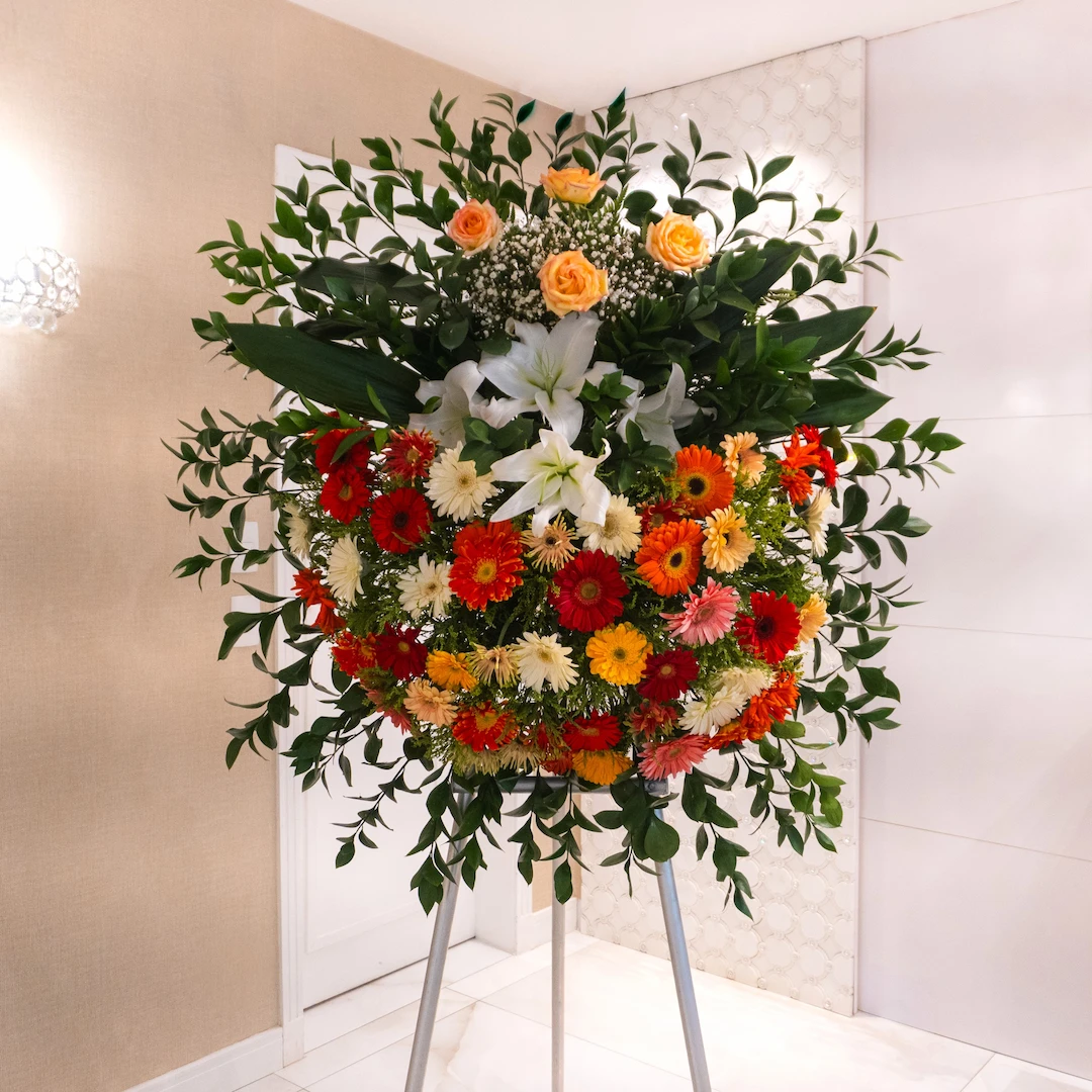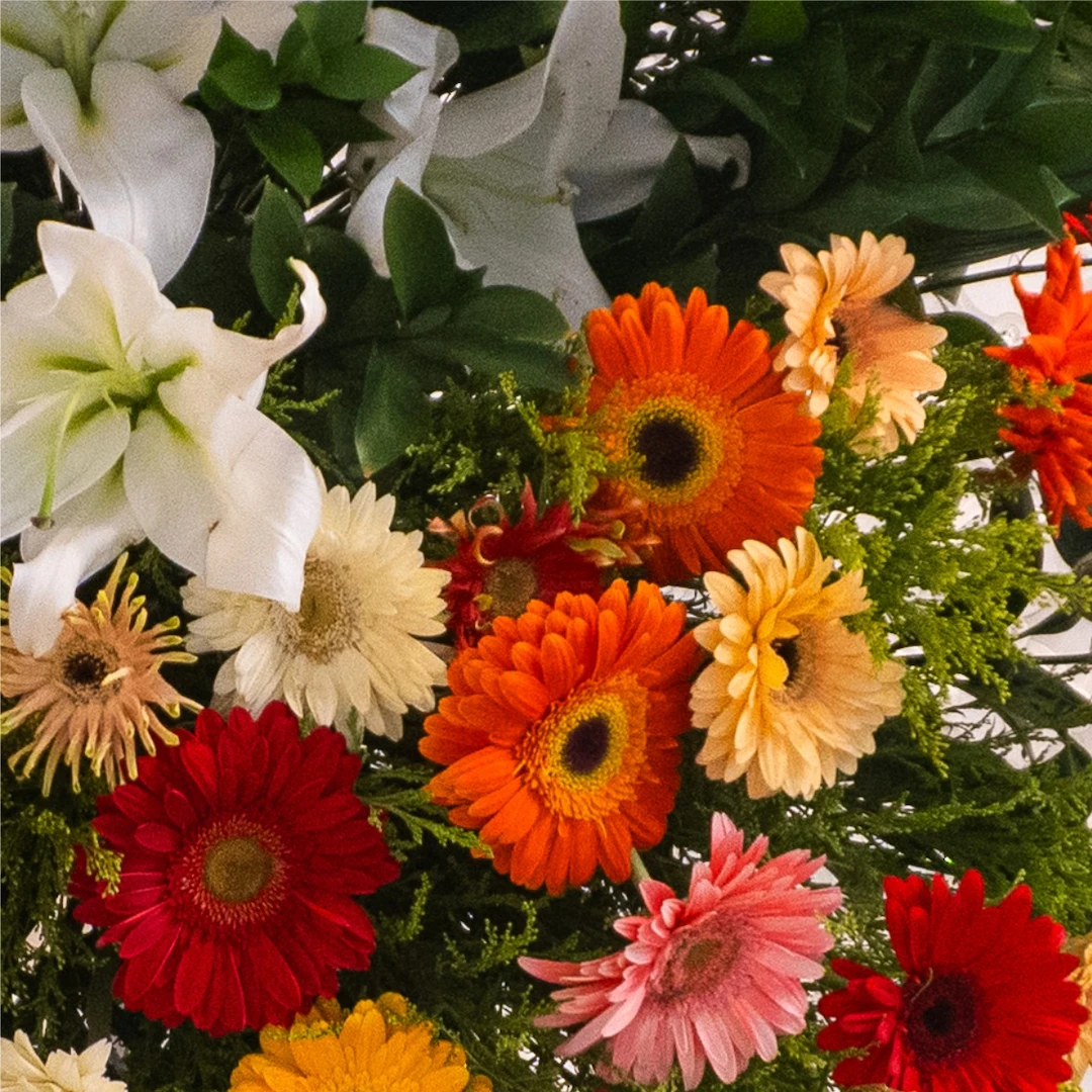 A Coroa Agape é uma composição das flores de Gerberas, Rosas, Lírio Bianco, Gypsophila, Tango, Aspidistra, Ruscus. Cada detalhe foi pensado para transmitir elegância e emoção, tornando essa coroa perfeita para homenagear com sofisticação e sensibilidade. Ideal para momentos que merecem uma expressão profunda de carinho e respeito.